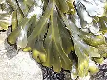 Rockweed can form thick bands in the middle intertidal on rocky substrates.[1] The other common species of Fucus: Fucus spiralis, Fucus vesiculosus and Fucus serratus along with Ascophyllum nodosum form the main and dominant seaweeds on rocky shores. These three species, along with two others Pelvetia canaliculata and Ascophyllum nodosum form the zones along the shore.