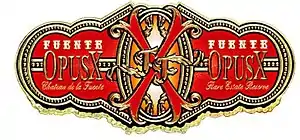 Fuente Fuente OpusX is the premier cigar line in the Arturo Fuente Cigar family.[1][2] Made by Tabacalera A. Fuente, this cigar is consistently ranked as the single most sought-after cigar in the world by Cigar Aficionado and the line is held by many to be the greatest cigar in history to date.[3] The cigars are rare and can be difficult to obtain. Prized by collectors, many OpusX's sell for 300% or more of their suggested retail price on the secondary market.[4] Fuente Fuente OpusX cigars are wrapped in tobacco leaves which are grown at the Chateau de la Fuente plantation in a tropic river valley in the Dominican Republic.