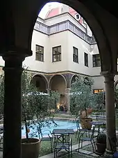 The outer facade, one of the longest on Maximilianstraße, showed the Fugger family riches, since there was a tax paid according to the length of a house's facade. Inside the complex Jakob created four courtyards with arcades, mosaics, tuscan marble and water basins. The Damenhof, with its Tuscan columns supporting arcades and painted arches, was designed as a family garden for female members of the family. The Zofenhof opens off the Damenhof, whilst the third and fourth courtyard (the Serenadenhof and Reiterhof) abut each other at the back of the building. Larger teams of horses could enter the complex through a high and wide gate - the Adlertor (Eagle Gate) - and leave through another on the Reiterhof.