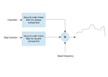 According to the model, F0 contour is generated as a result of the superposition of the outputs of two second order linear filters with a base frequency value. The second order linear filters are for generating the phrase and accent components of speech. The base frequency is the minimum frequency value of the speaker. In other words, F0 contour is obtained by adding base frequency, phrase components and accent components. The model was proposed by Hiroya Fujisaki.