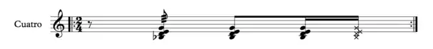 The meter of the fulía oriental is in 2/4 and may be lightly swung,[19] but is otherwise clearly defined. The rhythm of the cuatro has seen some mild controversy, given that the way it is performed by local musicians differs from the way musicians not from the east perform it.[17] Below is an example of the rhythmic pattern eastern cuatro players follow:
