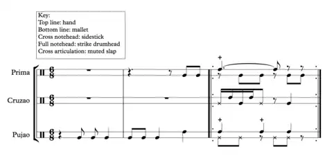 The fulía central is played in a duple meter. Though it is often written in 6/8 or 2/4, the groove is difficult to accurately notate. However, an approximation of the patterns of the prima, cruzao, and pujao can be found to the right:[4][16]