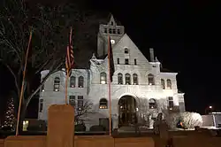 The Fulton County Courthouse is a historic courthouse located at Rochester, Fulton County, Indiana. It was built in 1895–1896, and is a four-story, Richardsonian Romanesque style limestone building. It has a cross-hall plan and features a central bell and clock tower with a pyramidal roof. In addition to the courthouse, the grounds have four memorials: one for the Pottawatomies' Trail of Death, a cornerstone for the Rochester College, and two war memorials.[2][3]