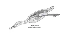 The holotype of Fumicollis, USNM 20030, was found by Harold Shepherd and George Sternberg in 1937 in the Smoky Hill Member of the Niobrara Chalk of Logan County, Kansas. Martin and Tate (1937) referred this specimen to Baptornis, also from the Niobrara Chalk.[2] However, Bell (2013) noted a number of characters distinguishing USNM 20030 from Baptornis, and Bell and Chiappe (2015) recognized it as a distinct taxon of hesperornithiform, which they named Fumicollis hoffmani.[1]