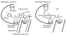 The proposed mechanism of action is depicted in figure 3. Fumonisin B1 occupies the space and electrostatic interactions of both sphinganine (or sphingosine) and fatty acyl-CoA in ceramide synthase. The part of FB1 that has structural similarity with sphingoid bases (the aminopentol part) may interact with the sphinganine binding site, whereas the negatively charged tricarbyllic acid groups may interact with the fatty acyl-CoA binding site.[9]
