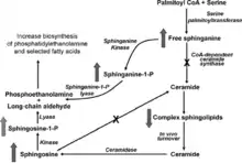 Figure 2: Sphingolipid metabolism showing the inhibition of ceramide synthase (x) by fumonisins and the changed concentrations of other compounds caused by this inhibition.[13]
