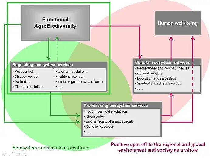 Functional agrobiodiversity offers regulating, provisioning, and cultural ecosystem services vital for human well-being. There are often positive synergies between these services and biodiversity conservation. A conceptual diagram illustrates these synergies. The green section of the diagram emphasizes the primary focus of the European Learning Network, while the red section underscores the beneficial impacts of functional agrobiodiversity on both the local environment (e.g., water quality, recreation) and the global environment (e.g., climate change). This diagram is adapted from the Millennium Ecosystem Assessment (2005). It's worth noting that supporting services are excluded from the diagram as they are not directly utilized by people.