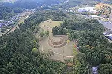 Two square tumuli are located a short distance outside the moat, and an iron sword with a deer horn handle and a stone spearpoint were excavated from the traces of the burial chambers. A little further away, on a small rise overlooking the settlement is a "two conjoined rectangles" type tumuli (zenpō-kōhō-fun (前方後方墳)), orientated to the north, which was found to have no grave goods. It is estimated to date from the end of the Yayoi period. [2]