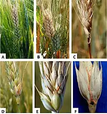 | (A,B) head blight symptoms; (C) brown/purplish discoloration below head; (D–F) orange sporodochia on spikelets | |