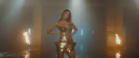 A screenshot of a scene in the music video portraying Elvana in a gold dress. She further wore five different outfits, created by Valdrin Sahiti, throughout the clip.[5]