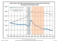 Development of population since 1875 within the current boundaries (Blue line: Population; Dotted line: Comparison to population development of Brandenburg state; Grey background: Time of Nazi rule; Red background: Time of communist rule)