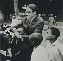 Caird's writings often stress the integration of theology and politics. Long before it was in vogue, he felt the urgency of including politics in any responsible theological dialogue. This is identifiable early on in Principalities and Powers; there, he repeatedly urged, the unusual phrase meant for Paul his unique take on the political, social, economic and religious power structures of this world.[60] And, as in his work on the historical Jesus, the importance of political concerns in Christianity remains central in his taking on of such varied topics as the modern Christian attitude to war ("War and the Christian"), the status of women in society ("Paul and Women's Liberty"), and apartheid. With regard to the last, his addresses to the South African Dutch Reformed Church (during his tenure in 1975–1976 as Moderator of the United Reformed Church) were later distilled and published as South Africa: Reflections on a Visit. A clarion call for the modern Christian Church's renunciation of racism, it demonstrated that for Caird the gospel, while profoundly religious, is not uniquely religious; it penetrates to all areas of personal and collective human activity.[28] His work as a humanitarian and churchman is perhaps best reflected in Our Dialogue with Rome: The Second Vatican Council and After, which his close friend Henry Chadwick called "a memorable little book" that attempts to bring some order out of the morass of Protestant–Roman Catholic dialogue, "with its unexpected moments of sudden joy and usually more numerous tears".[61]