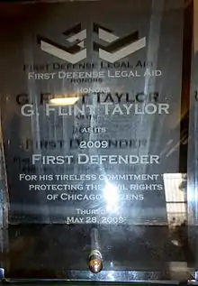 2009: First Defense Legal Aid's First Defender Award given to G. Flint Taylor for his "tireless commitment to protecting the civil rights of Chicago citizens."