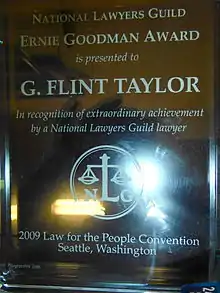 2010: National Lawyers Guild Chicago Chapter's Arthur Kinoy Award given to G. Flint Taylor for his "steadfast commitment to the struggle for justice for the survivors of torture." (Shared with law partners Joey Mogul and John Stainthorp) - 2009 – First Defense Legal Aid's First Defender Award for a "tireless commitment to protecting the civil rights of Chicago citizens."