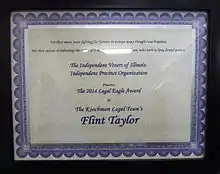 G. Flint Taylor (born April 16, 1946) is an American human rights and civil rights attorney based in Chicago, Illinois, who has litigated many high-profile police brutality, government misconduct and death penalty cases. Taylor has pursued public interest law to take on allegations of corrupt police tactics and wrongful convictions in the city of Chicago and elsewhere. Taylor was part of a team of negotiators in the 2015 landmark decision by the City of Chicago to award reparations to the survivors of police torture, becoming the first municipal government to do so.[1]