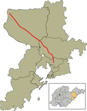 The G2011 Qingdao–Xinhe Expressway (Chinese: 青岛—新河高速公路), commonly referred to as the Qingxin Expressway (Chinese: 青新高速公路), is a 109.08-kilometre-long Chinese expressway (67.78 mi)[1] located in the sub-provincial city of Qingdao, in the province of Shandong. It is part of China's National Trunk Highway System and connects Chengyang District with the county-level cities of Jimo and Pingdu. It is a spur of G20 Qingdao–Yinchuan Expressway.[2]