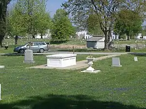 This was the second memorial built by the Grand Army of the Republic in the commonwealth of Kentucky, with the first being built in Kentucky's capital city of Frankfort, Kentucky, the Colored Soldiers Monument in Frankfort. Most GAR monuments are built in courthouse squares, but both in Kentucky are in cemeteries.[2] By the time interest in building such memorials to the Civil War had waned; most G.A.R. had been built long before Covington's. It is the only monument related to the war in Kentucky shaped like a sarcophagus. It measures three feet high, three feet tall, and is ten feet long. It is made of concrete, and was painted white.[3][4] In 1926 the James A. Garfield Post of the G.A.R. asked to have a cannon placed in Linden Grove. Senator Richard P Ernst came through with a 35 millimeter cannon from World War 1. In 1929 Oliver Perry Sine, a member of the G.A.R. veterans group, built a pedestal on which to place the cannon along with a flag pole, a flower stand and a temporary podium. At some point the cannon was either stolen or scrapped during World War 2 . The pedestal then became the monument and is on the national register. Most monuments to the War in Kentucky were made to honor Confederate soldiers/veterans/memories. Though many regions in the state were pro-Union during the war, by Reconstruction Kenton County, Kentucky was one of the few places in Kentucky where sentiment was still decidedly pro-Union, which is why the Grand Army of the Republic chose Covington in particular for this monument.[3]