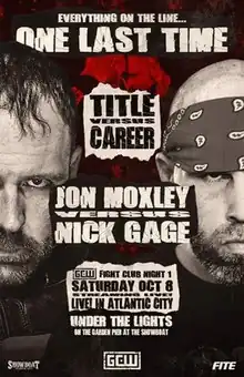 The rivalry between Jon Moxley and Nick Gage dates back to the late 2000s during the two wrestlers' tenures in Combat Zone Wrestling (CZW); in their final encounter before Moxley signed with WWE, Moxley defeated Gage in a no ropes barbed wire match in October 2010 to retain the CZW World Heavyweight Championship.[10] Eleven years later, on April 9, 2021, Moxley made a surprise return to GCW, confronting and attacking Gage after he had successfully retained the GCW World Championship at the promotion's rSpring Break event.[10] On October 9, at Fight Club: Mox vs. Gage, Moxley, who had defeated Matt Cardona to win the GCW World Championship the previous month, defeated Gage in a death match to retain his championship.[2] On August 13, 2022, at Homecoming Weekend, Gage challenged Moxley to rematch for the GCW World Championship, which Moxley said he would only grant if Gage agreed to risk his career in a Championship vs. Career match.[2] Gage accepted the stipulation.[11][12] The match was officially announced for Fight Club on August 30.[2][13]