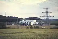 Switchyard of former GKK Etzenricht. On the right the pylon by which the powerline to Czech runs, left from this the valve hall, on the left the only remaining AC filter