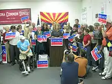 Giffords switched her party affiliation from Republican to Democratic in 2000 and was elected to the Arizona House of Representatives in 2001.[1] She was elected to the Arizona Senate in the fall of 2002, at the time the youngest woman elected to that body. She took office in January 2003 and was re-elected in 2004. She resigned from the Arizona Senate on December 1, 2005, in preparation for her congressional campaign.