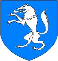 Arms of Donne: Azure, a wolf rampant argent, with addition of a chief argent, as borne by Gabriel Donne.[1]