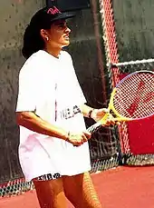 Gabriela Beatriz Sabatini (Spanish pronunciation: [gaˈβɾjela saβaˈtini]; born 16 May 1970) is an Argentine-Italian former professional tennis player.[1] A former world No. 3 in both singles and doubles, Sabatini was one of the leading players from the mid-1980s to the mid-1990s, amassing 41 titles. In singles, Sabatini won the 1990 US Open, the Tour Finals in 1988 and 1994, and was runner-up at Wimbledon 1991, the 1988 US Open, and the silver medalist at the 1988 Olympics. In doubles, Sabatini won Wimbledon in 1988 partnering Steffi Graf, and reached three French Open finals. Among Open era players who did not reach the world No. 1 ranking, Sabatini has the most wins over reigning world No. 1 ranked players.[2] In 2006, she was inducted into the International Tennis Hall of Fame and in 2018 Tennis Magazine ranked her as the 20th-greatest female player of the preceding 50 years.