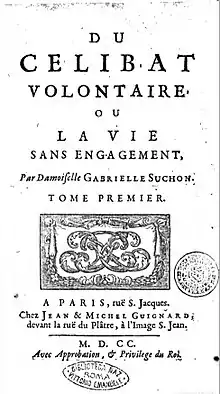 Suchon's work did receive some attention in France when she first released her writings. Both Suchon's Traité de la morale et de la politique (1693) and Du Célibat volontaire (1700) were reviewed in Le Journal des Savants, one of the premier intellectual journals in France, the year they were published. Du Célibat volontaire was also featured in another notable French journal, Nouvelles de la République des Lettres after its release.[1] Recognition by these premier French journals shows that some intellectuals saw the quality of Suchon's work and took her perspective seriously.