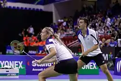 She paired up with her husband Chris Adcock, whom she married in 2013, and won the 2013 Hong Kong Super Series against the world No.1 and Olympic Champion, Zhang Nan and Zhao Yunlei, 21–12, 21–16 in the semifinals round.[5] They also won the 2014 Swiss Open Grand Prix Gold against Chai Biao and Tang Jinhua 21–17, 21–13.[6] She competed in the 2014 Commonwealth Games, winning gold in the mixed doubles alongside her husband.[7]
