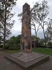 The memorial is situated near the western corner of the park at the top of a grassy avenue flanked by hedges and eucalypt trees. It is in the form of an obelisk, 20 feet (6.1 m) high and square in section composed of coursed blocks of Brisbane tuff (porphyry). It is set on a sloping plinth faced with masonry tiles and is surrounded by a paved area. Bronze memorial tablets beneath bronze laurel wreaths are set low on the sides of the shaft. These are inscribed "In Memory of Fallen Comrades" with the dates beneath commemorating the First and Second World Wars and the Korean, Malaya, Vietnam and Borneo conflicts. The fourth plaque commemorates the dedication of the memorial and is inscribed "Unveiled by his Excellency the Governor of Queensland Lieutenant General Sir John Laverack KBE, CB, CMG, DSO and dedicated by Reverend A G Reilly on 25 April 1951".[1]