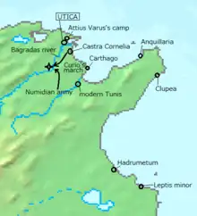 In August 49, he set sail from Lilybaeum and landed near Anquillaria on Cape Bon in Africa.[23] There, he faced Attius Varus and King Juba I of Numidia, who had sided with Pompey.[23] Although he won the Battle of Utica, he was forced to withdraw and eventually defeated by Saburra, Juba's general, at the Battle of the Bagradas River where he fought to the death, along with his army, rather than attempting to flee to his camp.[24]