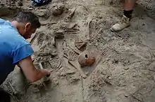 The Ukrainian sotnia led by "Wowka" (Wolf) rounded up the Poles and escorted them to the school building. Many Poles were killed directly on their farms and along the road, or in the bushes while trying to escape.[2][5] Most victims were murdered in the school building, with automatic weapons and farm tools; their bodies thrown into the adjacent ditch. About 600 Poles (200 identified by name)[4] were killed in total, and 150 farms were robbed and scorched afterwards, along with the Catholic church.[2][4][6] A few days after the massacre, the Polish self-defence unit arrived at the Gaj colony from nearby Rożyszcze. The Poles were shocked by what they saw. The ditches and cellars were filled with dead bodies. In their vicinity lied the murder weapons: axes, pitchforks, hoes, saws and bars covered in blood. The self-defence identified and executed several Ukrainian collaborators and burned several Ukrainian houses. They then evacuated the few surviving Poles to Rożyszcze. In 2013 a group of archaeologists discovered one of the mass graves in the no longer existing village. They found the remains of 80 people, most of them were children. Other mass graves have already been destroyed in postwar years including during the construction of the local landfill.[4][6]