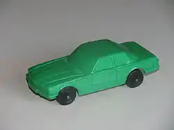 Most Galanite cars produced were in the four inch range at a scale of 1:42, but the company also made large pedal cars. Swedish vehicles were common like Volvo, Saab, and Scania trucks, possibly related to Galanite's parts and promotional connections, but Volkswagens and other vehicles like Mercedes Benz and the BMC Mini were also made. Like most rubber vehicles, construction was of only seven parts: a molded vinyl body, two metal axles, and four plastic tires. These toys were child friendly - soft vinyl, rounded edges and fun colours.
