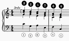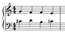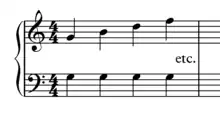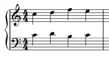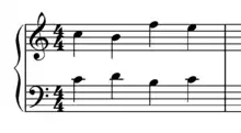 The Fenaroli features four events, with the melody featuring a descent from scale degree 4 to scale degree 3 followed by an ascent from scale degree 7 to scale degree 1.[1] The Fenaroli bass features a stepwise ascent from scale degrees 7 to 3. Another common Fenaroli melody is scale degree 2 to scale degree 3, then scale degree 7 to scale degree 1, which creates a canon with the bass.[17] A countermelody exists for the Fenaroli, as taught by Francesco Durante.[18]