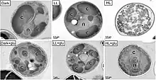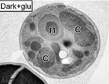 | Galdieria partita cell. n: nucleus; c: chloroplast | |