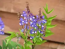 This species is a perennial herb with a taproot and rhizome system. It produces stems up to 2 meters tall which branch near the middle. The leaves are pinnate. The inflorescence bears up to 70 lilac-colored flowers,[1] and some cultivars can produce more.[3] The fruit pod is up to 4 centimeters long and contains up to 8 seeds each a few millimeters in length.[1]