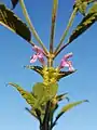 This upright-growing herbaceous annual hempnettle can reach from 20 to 50 centimetres of height and usually has spread out upper part. Its four-edged stem is covered with both soft and bristle-like hair, with bristles primarily covering plant's nodes. In most cases the stem is thickened right below the nodes. Its alternately arranged simple and entire leaves are always petiolate (with leafstalk), serrated and covered with trichomes.[5][6][4] They can reach the length of 7 centimetres[4] and are lanceolate to ovate-lanceolate in shape and end with sharpened point.[5] There are no stipules.[6]