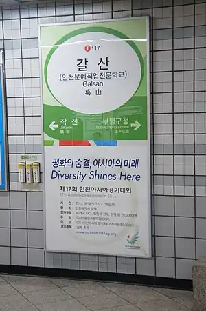 Galsan Station (Korean: 갈산역; Hanja: 葛山驛) is a subway station on Line 1 of the Incheon Subway in Bupyeong-gu, Incheon, South Korea.