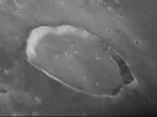 Gambart is a small lunar impact crater on the Mare Insularum, near the central region of the Moon. It is named after French astronomer Jean-Félix Adolphe Gambart.[1] It can be located to the south-southeast of the prominent ray crater Copernicus. In the past, the floor of Gambart has been flooded with lava, leaving a relatively flat surface surrounded by a smooth but somewhat polygon-shaped outer rim. To the southwest of Gambart is an area of hilly terrain deposited from ejecta during the Mare Imbrium impact, known as the Fra Mauro Formation.