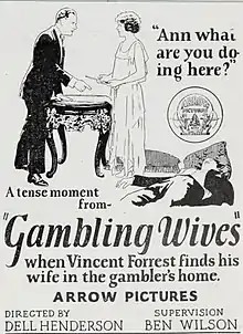 Gambling Wives is a 1924 American silent melodrama film. Directed by Dell Henderson and produced by actor-producer Ben F. Wilson, it was released through Arrow Films. The film stars Marjorie Daw.[2]