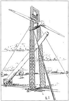 The other bid winner was Karlstads Mekaniska Werkstad KMW (also known as Kamewa), which proposed a 75 m, two-bladed, upwind turbine with a beveled gear that enabled placing the asynchronous generator inside the tower rather than the nacelle.[23] In 1984, the WTS-75, a 2 MW wind turbine, started operations in Näsudden on the south coast of Gotland, Sweden.[23] As was the case with the WTS-3, a number of components of the WTS-75 wind turbine had to be repaired or modified within the first years of operation.[23] The WTS-75, like most other multi-MW wind turbines during its era, did not have a teetering hinge and had a stiff tower that was made of concrete, which was considerably thicker than soft steel towers.[23]
