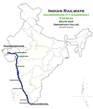 It operates as train number 16335 from Gandhidham Junction to Nagercoil and as train number 16336 in the reverse direction serving the states of Gujarat, Maharashtra, Goa, Karnataka, Kerala & Tamil Nadu.