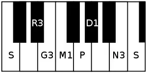 - avarohaṇa: Ṡ N₃ D₁ P M₁ G₃ R₃ S[lower-alpha 2]