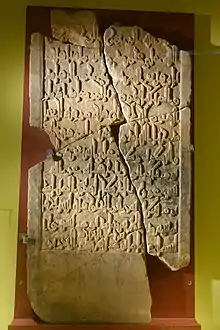 Gao-Saney became well known among African historians because French administrators discovered here in a cave covered with sand in 1939 several finely carved marble stelae produced in Almeria in Southern Spain.[10] Their inscriptions bear witness of three kings of a Muslim dynasty bearing as loan names the names of Muhammad and his two successors. From the dates of their deaths it appears that these kings of Gao ruled at the end of the eleventh and the beginning of the twelfth centuries CE, and represent a transition in leadership.[11]