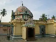 Thirukarukavoor Temple is dedicated to Shiva and is located near Papanasam, Thanjavur, Tamil Nadu, India. The nearest railway station is in Papanasam, about 3 kilometres from the place. The nearest airport is in Trichy. Thirukarukavoor is situated in Thirukkarugavur, a village located on the banks of Vettar River, a tributary of River Cauveri.[9] People from Chennai and northern parts of Tamil Nadu may reach Kumbakonam and from there to Thirukarukavoor. People from east and southern parts of Tamil Nadu must reach Thanjavur and from there to Thirukarukavoor. The temple is one of the prominent and most visited temples in the district.[10] The temple has a 5-tier Rajagopuram and an outer prakaram(closed precincts of a temple). The temple is 460 ft by 284 ft and has a gopuram facing east and also has an entrance facing south.[2] There is a garden in the southern side and a Vasantha Mandapam in the north.[2] The sanctum of Mullaivananathar is in the second precinct and the shrine of Amman is located parallel to the Swami shrine. The shrine is Nandi is located in front of Swami, with the Palipeeda and Dwajasthambam located right behind the Nandi.[2] There is a Nataraja hall and a yagasalai. There are separate shrines for Nataraja, Somaskanda, Karpaga Vinayagar and Navagrahas.[2] There are separate shrines for Sekkizhar, Nalvar, Santhanachariar, Dakshinamurthy, Nrithivu Nayakkar, Arthanariswarar, Mahalakshmi, Arumugam, Brahma, Durga and Chandikeswarar.[2] There are four water bodies associated with the temple. Sheerakundam (Parkulam) is the temple tank located opposite to the temple and the water is believed to be born out of the milk of Kamadenu, the sacred cow.[11] Sathyakupam is a well located in between the shrines of Swami and Amman. Brahma Theertham is a tank located north east of the temple - Nataraja gives theerthavari during Karthigai Thivatharai in this tank.[11] Vritha Kaveri is the branch of Kaveri, Vettaru (also called Mullivay) - the stepshore is the bank for many of the temple occasions.[11] The temple tree, Mullai tree is located in between the Swami shrine and Chandikeswarar shrine.[11] In 2020, a hall for Annadhanam was added by the Hindu Religious and Endowment Department, by the Government of Tamil Nadu.[12]