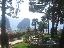 From the Gardens of Augustus one can get a 180-degree panoramic of the island of Capri because one can see Mount Solaro, the bay of Marina Piccola, and the Faraglioni.[2]