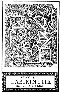 In 1665, André Le Nôtre planned a hedge maze of unadorned paths in an area south of the Latona Fountain near the Orangerie. (Loach, 1985) In 1669, Charles Perrault – author of the Mother Goose Tales – advised Louis XIV to remodel the Labyrinthe in such a way as to serve the Dauphin's education (Perrault, 1669).[43] Between 1672 and 1677, Le Nôtre redesigned the Labyrinthe to feature thirty-nine fountains that depicted stories from Aesop's Fables. The sculptors Jean-Baptiste Tuby, Étienne Le Hongre, Pierre Le Gros, and the brothers Gaspard and Balthazard Marsy worked on these thirty-nine fountains each of which was accompanied by a plaque on which the fable was printed, with verse written by Isaac de Benserade; from these plaques, Louis XIV's son learned to read. Once completed in 1677, the Labyrinthe contained thirty-nine fountains with 333 painted metal animal sculptures. The water for the elaborate waterworks was conveyed from the Seine by the Machine de Marly. The Labyrinthe contained fourteen water-wheels driving 253 pumps, some of which worked at a distance of three-quarters of a mile.[44] Citing repair and maintenance costs, Louis XVI ordered the Labyrinthe demolished in 1778. In its place, an arboretum of exotic trees was planted as an English-styled garden. Rechristened Bosquet de la Reine, it would be in this part of the garden that an episode of the Affair of the Diamond Necklace, which compromised Marie Antoinette, transpired in 1785 (Marie 1968, 1972, 1976, 1984; Perrault 1669; Thompson 2006; Verlet 1985).