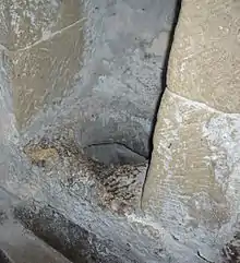The term garderobe is also used to refer to a medieval or Renaissance toilet or a close stool.[2] In a medieval castle, a garderobe was usually a simple hole discharging to the outside into a cesspit (akin to a pit latrine) or the moat (like a fish pond toilet), depending on the structure of the building. Such toilets were often placed inside a small chamber, leading by association to the use of the term garderobe to describe the rooms. Many can still be seen in Norman and medieval castles and fortifications, for example at Bürresheim Castle in Germany, where three garderobes are still visible.[3] They became obsolete with the introduction of indoor plumbing.