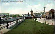 Gardner gained train service on the Fitchburg Railroad (via the Vermont & Massachusetts) in 1851.[2] Located at the intersection of the Fitchburg Railroad with the Boston, Barre and Gardner Railroad (which began service to Worcester in 1871), Gardner once had a large union station which was angled to serve both lines.[2][3] The Fitchburg bought the BB&G in 1885, and was itself bought by the Boston and Maine Railroad in 1900.[2] The "Biggest Chair", a 12-foot-tall chair made by a local company, was placed in the station lawn around 1910. Passenger service to Worcester ended in March 1953, and service to Boston ended in 1960 when the B&M discontinued all trains west of Fitchburg, ending more than a century of rail service.[2] Union Station was demolished soon after.