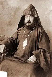 Karekin Srvandztiants was born in Van in the Ottoman Empire in 1840.[2] He was the uncle of military commander Hamazasp Srvandztyan. Srvandztiants was educated at the seminary of Varagavank monastery under the mentorship of Mkrtich Khrimian, well-known Armenian religious figure. Under his tutelage, Srvandztiants toured Eastern Armenian (also known as Russian Armenia) where he surveyed the living condition and cultural characteristics of the local population.[3] In 1862 he moved with Khrimian to the St. Karapet Monastery near Mush, where he edited the journal Artsvik Tarono (The Eaglet of Taron). Srvandztiants was ordained a celibate priest in 1864 in the city of Erzurum (known to the Armenians as Karin).[3][4] In 1866, two years after being ordained, Srvandztiants moved to Constantinople where he continued to be a priest and a community figure.[3] A year later, he moved back to Erzurum where he supervised Armenian schools in the area. Thereafter, Srvandztiants was entrusted with the task of carrying out the reforms of the newly drafted Armenian National Constitution. He was made the head of St. Karapet Monastery where he would serve for several years.[3] After the Russo-Turkish War (1877–78), the rights of Armenians were guaranteed under Article 16 of the Treaty of San Stefano, stipulating that the Russian forces occupying the Armenian-populated provinces in the eastern Ottoman Empire would withdraw only with the full implementation of reforms. Srvandztiants was then tasked to collect data and information of the Armenian population in the eastern provinces and report to the Patriarch of Constantinople. Meanwhile, however, Srvandztiants also documented many Armenian oral histories and collected many examples of epic folklore which had been passed down orally for generations.[3]
