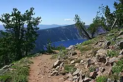 The Garfield Peak trail is a hiking route that travels over or parallels the westernmost stretch of the southern rim of Crater Lake.[11] Most of the northern ridges of the trail has views of the lake and its two islands. The trail is non-paved and runs 1.7 miles (2.7 km) from the Crater Lake Lodge up a moderate rated ascension gain of 1,122 feet (342 metres) of elevation up to Garfield Peak.[12] From Garfield Peak the trail has access to continue to a relative plain section of Crater Lake southernmost ridge past Eagle Crags towards Applegate Peak.